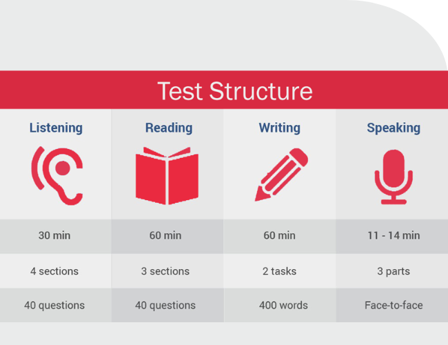 - The listening, reading and writing tests take 2 hours and 40 mins. There is no break so make sure you go to the toilet before you enter the exam room. If you need the toilet during the test, put your hand up and the invigilator will let you go. But you will lose valuable time by doing this and it could affect your score.